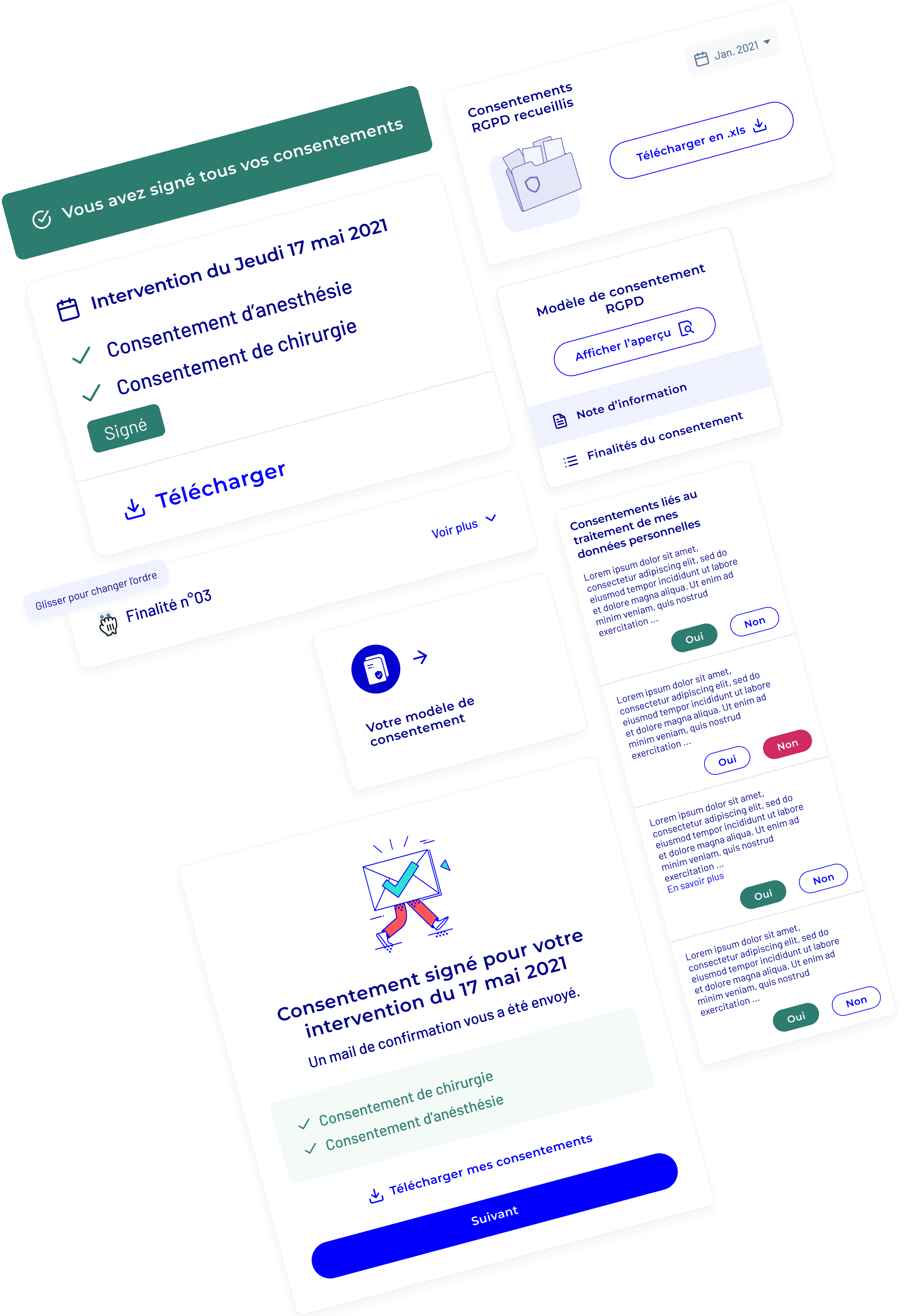 The goal of this project was to deliver a comprehensive solution for hospitals to manage and collect patient consent in a secure and user-friendly way. To accelerate this initiative, Docaposte acquired a startup specialized in this field, with the mission to redesign their tools and transform them into fully integrated Docaposte products. The main challenge was to create interfaces that could serve a wide range of users : patients, doctors, secretaries, and administrative staff.